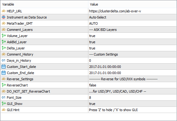 • RerverseChartr is the option to swap ask/bid values and reverse delta values, which is required for Usd/xxx pairs. Do not set this option to the "true" values if your MetaTrader ticker has the following value: USD/JPY, USD/CAD, USD/CHF because the indicator will find them automatically. This option is required if you have ticker name like "Japanese Yen" instead of "USD/JPY".