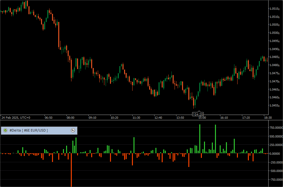 The Delta indicator shows the difference between market buyers and sellers. The indicator shows the difference between the volume executed at the Ask prices (bearish trades) and the volume executed at the Bid prices (bearish trades).