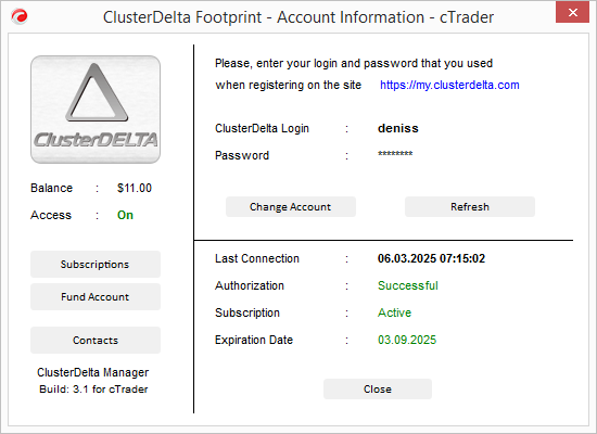 To work with cTrader indicators without interruption, you must enter your ClusterDelta Login and Password into "ClusterDelta Manager" (also known as Authorizer). Open it by clicking the "ClusterDelta Manager" button or by clicking the access status icon on them main toolbar, use the "Change Account" button, enter your details, and press "Save". "Refresh" to confirm correct entry, that Authorization is Successful and Subscription is Active with a valid Expiration Date. All of the ClusterDelta product authorizers on the same computer share the login credentials.
