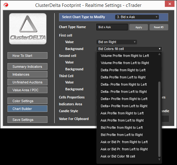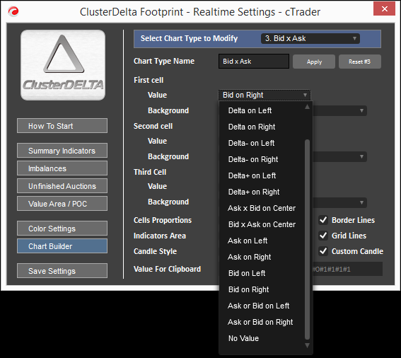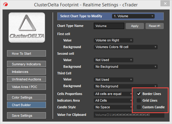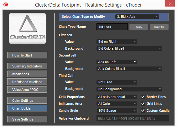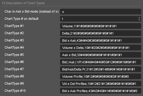 The Chart Types strings contain prepared settings for the orderflow chart. It is not necessary to explain this format here as it is automatically generated by the Chart Builder, so you can use it to generate this string. The Chart Types strings are not 100% compatible with other ClusterDelta Footprint/Orderflow products
