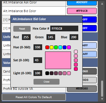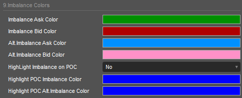 Alt. Imbalance Ask Color is the color of the Alternative Imbalance object if Ask>Bid and Ask:Bid is equal to or greater than the Alternative Imbalance Ratio.