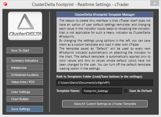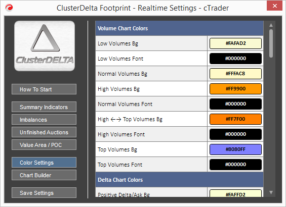 The Color Settings tab is designed to find the right color template for your footprint chart. It is very complicated to do it through the cTrader Options Panel, because it always reloads the indicator on each color change. The color set will be used during the current indicator session, but you can save the color set in the template and use it later. Please refer to the "Saving settings" section to learn more about how it works.