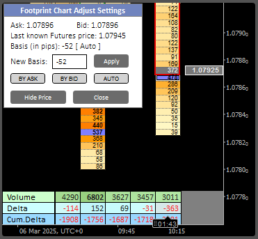After clicking on the current price box, a small window "Footprint Chart Adjust Settings" will appear in the left top corner. It contains the last known spot and futures prices, the current Basis value in pips and the option whether it is set manually or calculated automatically.