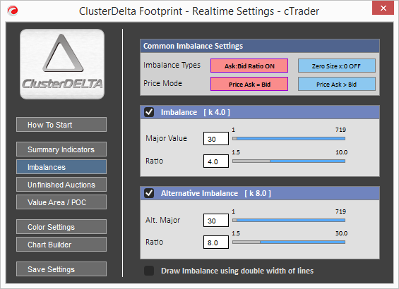Alternative Imbalance is the possibility to separate the high Ratio Imbalances from the Normal ones. The Alternative Imbalance Range is 1.5 - 30 and it is required that Alt.Ratio must be greater than Ratio of the Normal Imbalance because Alternative Imbalance always overwrites Normal Imbalance.