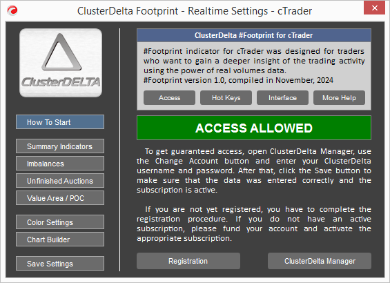 The content of this page has the quick references to the descriptions of the Hot Keys and the Advanced Toolbar in the Interface tab, the More Help button opens the official page of the description of the cTrader Footprint Indicator. If you have just downloaded and installed the indicators, they will not work without an active subscription. Use the "Register" button to sign up at https://my.clusterdelta.com if you are not registered yet. If you have registered, you have to order and activate the subscription in your cabinet.