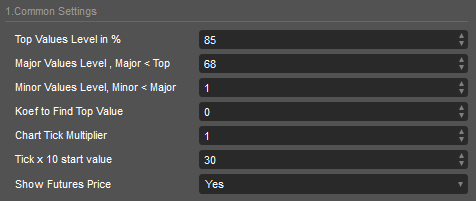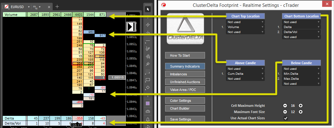 The Summary Indicators section allows you to customize your workspace with summary data such as volumes/delta per bar, cumulative delta, min/max delta, and Delta/Volume ratio in percentage. There are four positions. fixed Top and Bottom chart positions and dynamic position of summary data above and below the candle. The distance between the summary data boxes and the candle is determined by the "Above/Below Distance from Cell" parameter in the Settings section "3.Summary Indicator Settings". The summary data uses its own cell height and font size, so the "Cell Maximum Height" and "Maximum Font Size" options set the maximum values for these options (the corresponding parameter names in the settings "Max Font Size" and "Max Cell Height"). The "Use Actual Chart Sizes" option applies only to the "Above/Below" candle position and changes the default height and font size to those used inside the candle (the corresponding parameter name in the settings is "Actual Size for Above/Below Summary").