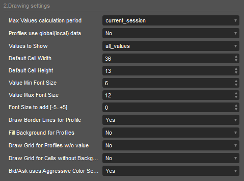 - Calculation Period list lets you choose which data periods are used to calculate the max values for a current session that applies to the color scheme of the chart as it depends from the absolute maximum value ("Cur Session" value means that the data used to calculate the maximum values of the current session is the only data available since the start of the current trading session, "Last+Current" value means that the data used to calculate the maximum values of the current session is the data available since the previous trading day, "Loaded chart" uses the all loaded data for a current chart)