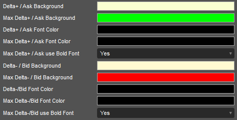 Max Delta+ / Ask Background s the background for the Delta Positive / Ask values that are higher than the Top Delta / Ask value. This color also used as the end color of the gradient background for Normal Positive Values together with "Delta+ / Ask Background" color as the start color.