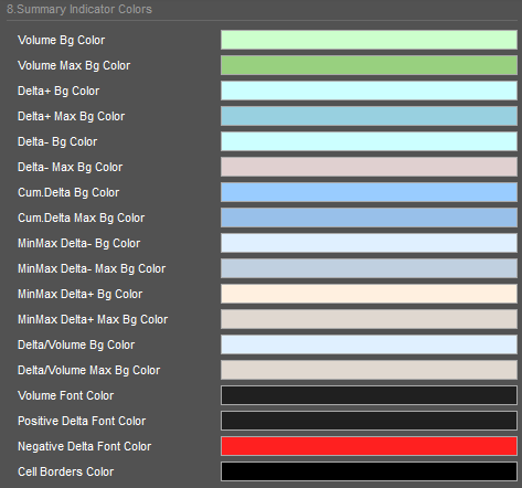 Cum.Delta Max Bg Color is the start and end color for the Cumulative Delta gradient, associated with the lowest and highest value of Cumulative Delta value.