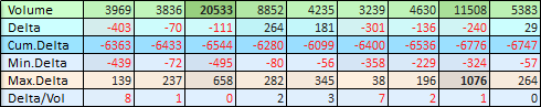 Max Delta- / Bid Background is the background for the Delta Negative values / Bid that are higher (in absolute value) than the Top Delta / Top Bid value, which is calculated using the same logic as the Top Volume value. This color also used as the end color of the gradient background for Normal Negative / Bid Values together with Delta- / Bid Background color as the start color.