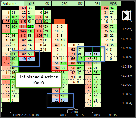 Unfinished auctions is the zone only at the high price or low price of the bar where both values of Ask and Bid are not zero. The presence of the opposite value shows that prices has attention to move further with the same direction but was met by a pressure from the opposite side and had to be reversed.