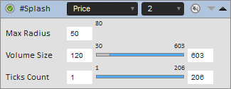 The Title of the Splash panel contains the "Authorizer" icon, the indicator name, the method of ticks aggregation, the number of days to load to load and display, where the value "None" removes Splash data from the chart, an Alert icon, an icon (arrow down) to open the Advanced Panel and the next icon (arrow up) to close the current Splash GUI panel. The hot key 'Z' hides this panel, and hot key 'X' shows it again.