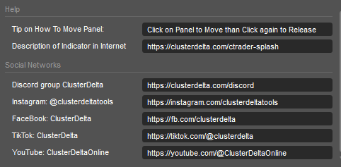 Common Settings describes the basic parameters of the indicator. The standard behavior of cTrader when changing values of any settings is to immediately reload indicators, which requires remote access to ClusterDelta servers to reload data, so it is highly recommended to change all settings the first time you attach an indicator to a chart. Options starting with '*' (asterisk) cannot be changed after the indicator is attached, as they are part of the GUI panel. Use the GUI panel to change the options allowed there, but in case you need to change options in the cTrader indicator settings panel, it will be easy to remove the indicator and reattach it with new settings changes./p>