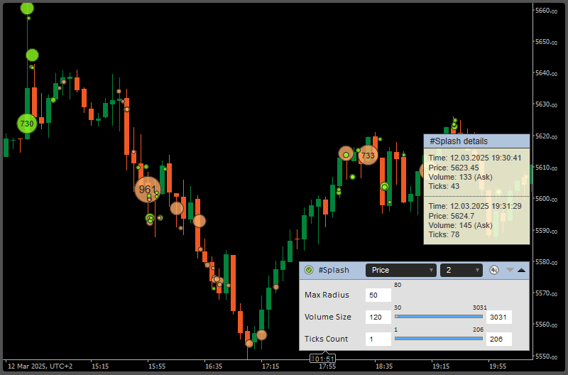 The Splash indicator is the first indicator in the ClusterDelta series that deeply analyzes tick history. This indicator is designed to search for large spikes in volume, when a large amount of the volume has passed in a short period of time.