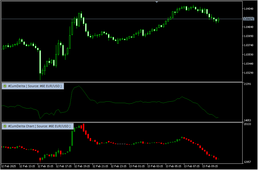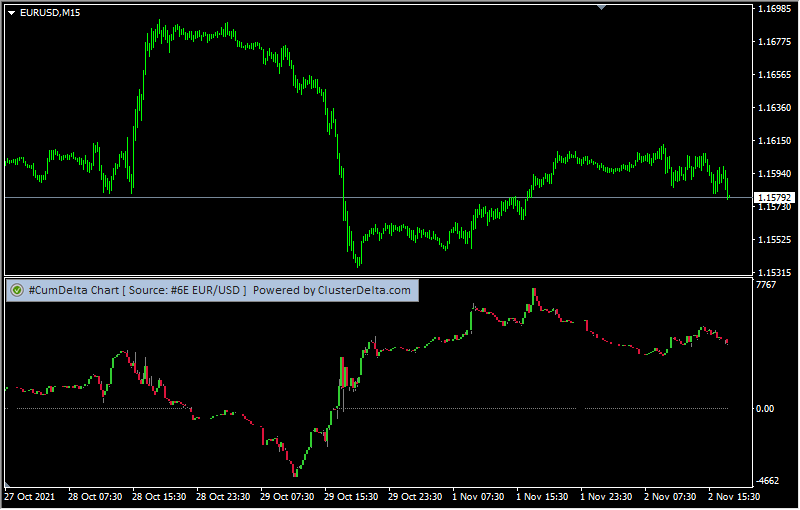 The data appears as a cumulative delta curve or as an OHLC delta plot in a separate window. In the highly liquid markets the accumulative delta practically repeats the price chart, but sometimes divergences can occur, which are a sign of a change in the price trend