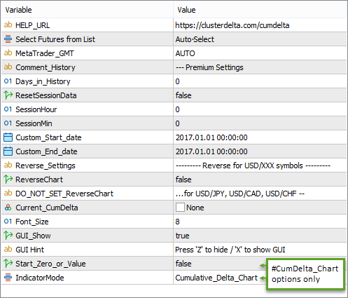 • Start_Zero_or_Value ( this parameter exists only in the ClusterDelta_#CumDelta_Chart indicator ) - the parameter indicates whether a new cumulative delta bar opens at zero value or at the first known delta value.