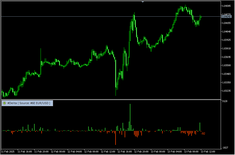 Delta indicator displays a histogram of the difference between the trading volumes at Ask and Bid prices (Delta = Ask-Bid as opposed to Volume = Ask + Bid).