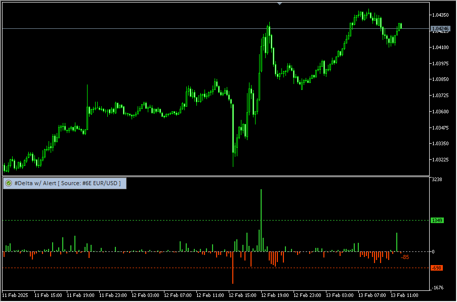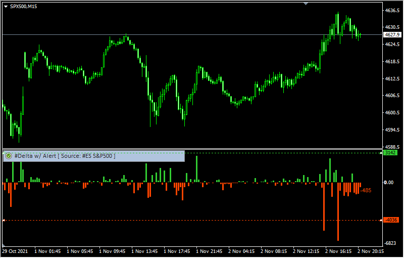 The #Delta_Alert indicator shows the difference between the volume executed at the Ask price or higher (bearish trades) and the volume executed at the Bid price or lower (bearish trades). This indicator has system of the internal sound alerts allows you to set any value for the alert, and if current delta reaches this value, a sound alert will be played.