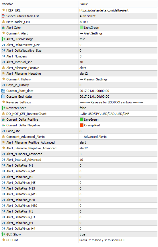 • Alert_DeltaMinusSize_H1 - the size (negative only) of the positive delta for the H1 timeframe to trigger the alert