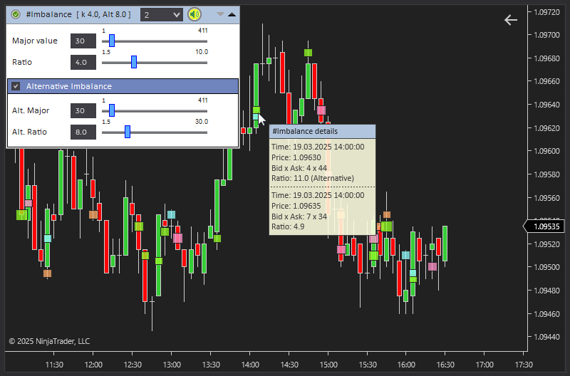 The Imbalance indicator is designed to display trade imbalances in the trading process. The most common form of imbalance is a significant ratio between buyers and sellers (Ask:Bid) or the complete absence of one of them.