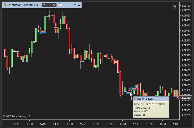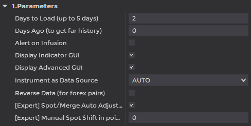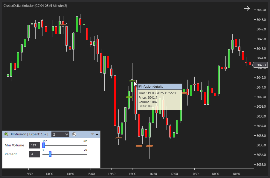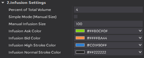 Percent of Total Volume is a percentage of the daily volume that would be used to calculate Infusion minimum volume size for the Expert mode. The infusion minimum volume size is averaged value of the traded volumes during last two weeks. The volumes counts as the amount of the volume by each price / time on defined timeframe. This is a proprietary algorithm ClusterDelta that allows you to find the size of a volume that is marked as large on the current session using the previous session's data. The available range is 1 - 20.