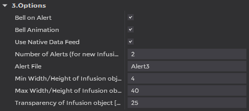 Alert on Infusion initiates the Alert event when the Infusion just appeared on the current bar (see the "Options" section for alert animations).
