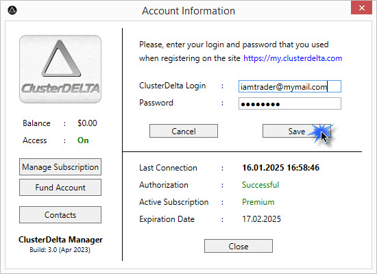 ClusterDelta Manager (aka Authorizer) is a way to identify you to the ClusterDelta Server for normal functionality. Just put your Clusterdelta username and password you used when registering (to do this, use the "Existing Account" or "Change Account" button on the first screen), and then use the "Save" button to save your data and try to refresh it using the "Refresh" button. Your Authorization should be Successful and Access should be On. You can close the window and continue your work by choosing an instrument to work with.