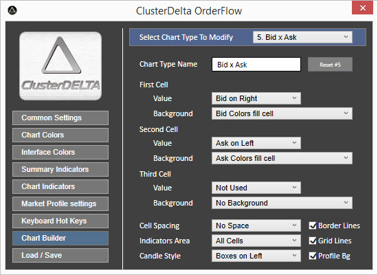 The Chart Builder allows you to customize the chart according to your needs. To rename the chart type, just put the new name into the Chart Type Name textbox. After rebuilding the "Chart Type" do not forget to Save settings (using the Load/Save section) if you want to use them in the future. To the right of the Chart Type Name field there is a Reset button, which restores the settings of the current chart to the ones they were at the start.