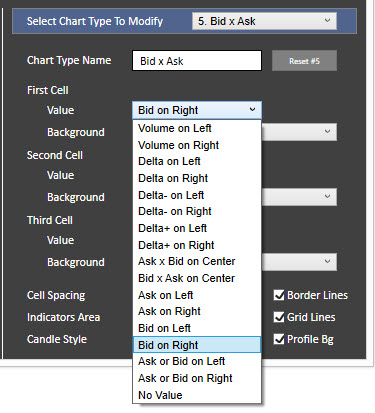 Each value can be left- or right-aligned ("Ask x Bid" or "Bid x Ask" are center-aligned). "No Value" is useful if you intend to use to use a cell with a background profile, but, in general, with no value, any background is acceptable. The values "Bid x Ask" and "Ask x Bid" are included to use one background (like a volume profile) behind these values.