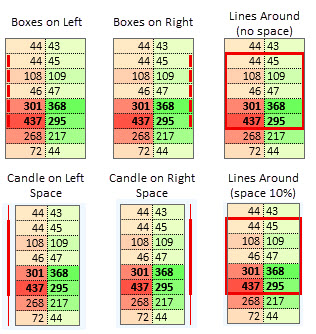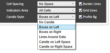 Candle Style option allows you to select the type and style of the Bull/Bear candle you would like to use. The style of the Boxes or Lines Around shows only the body of the candle and the remaining part of the bar at the top and bottom are the wicks. The Candle on the Left/Right Space looks like a simple OHLC candle. There are examples on the image below.