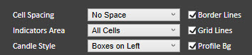 The chart can be split up in 3 cells. Each cell contains a value and a background. In each cell, the value can be one of the following: Volume, Delta, Delta Negative only, Delta Positive only, Ask, Bid, Ask or Bid (larger value), Ask and Bid (or Bid and Ask) or No Value.