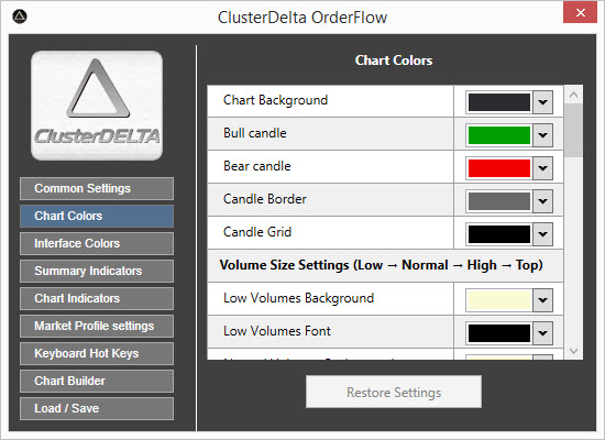 The Chart Colors describe mostly colors that are used during chart drawing. Restore Settings button will restore the changed values by the ones that were loaded at startup (or was reset in Load/Save section)