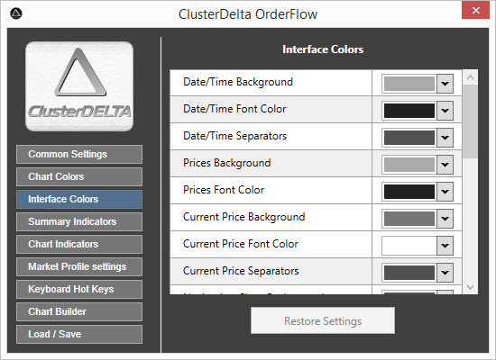 The Interface Colors describe the colors that are using in Workspace and around it to improve the chart reading. Restore Settings button will restore the changed values by the ones that were loaded at startup (or was reset in Load/Save section)