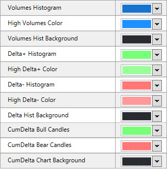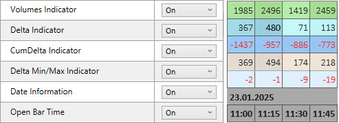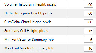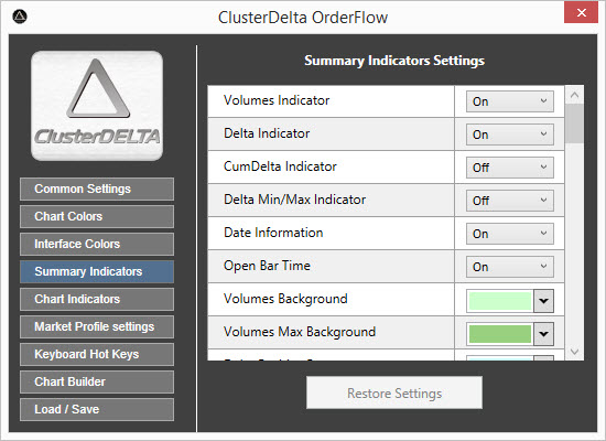 Summary Indicators Settings manage the options and colors of the summary top/bottom indicators like Volumes, Delta, Cum.Delta, Min/Max Delta per bar.