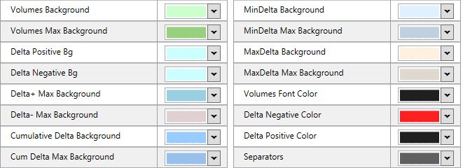 Cum Delta Max Background is the start and end color for the Cumulative Delta gradient, associated with the lowest and highest value of Cumulative Delta value.