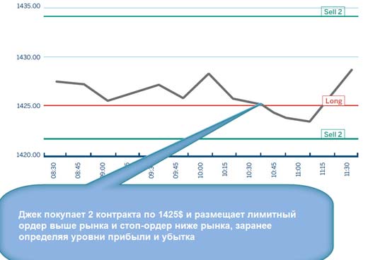 Джек купил два контракта E-mini S&P 500. Теперь он будет контролировать свою позицию. В дополнение к этому, Джек разместит лимитный ордер выше рынка, чтобы взять прибыль, если рынок будет расти и стоп-лосс - ниже, если рынок будет двигаться против него.