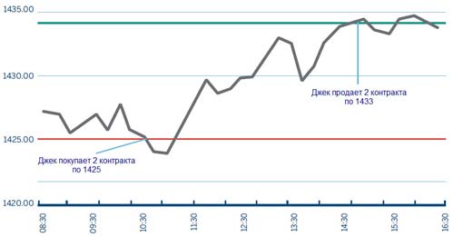 Для Джека имеет смысл торговать фьючерсами на E-mini. Вместо необходимости исследования относительно большого числа акций, он может торговать единственным контрактом, представляющим весь фондовый рынок. Джек может торговать контракты на E-mini S&P 500 почти 24 часа каждый день всю рабочую неделю. Джек ожидает рост S&P 500, таким образом, он хочет купить, или занять длинную позицию.
