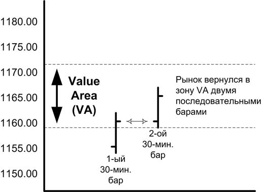 На иллюстрации ниже можно увидеть, что рынок открылся в области VA, затем вышел за пределы и через несколько часов вернулся обратно. Таким образом, закрытие вошедшего внутрь бара внутри VA и открытие следующего так же внутри VA является сигналом к реализации правила 80%: