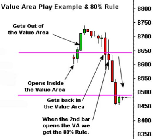 Правило 80% - это концепция поведения цены, в случае если цена выходит за пределы основного торгового диапазона, который расчитывается как 1-ое стандартное отклонение между вершинами установленными в ходе торгов на предыдущей сессии.