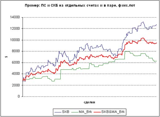 Проанализируем только применение тактики ММ "Фиксированный лот" для обеих стратегий: как можно видеть из колонки Фикс.лот, игра на одном депозите несколькими (в данном случае - двумя) тактиками, по сравнению с игрой на таком же по размеру депо каждой из них отдельно прогнозировано приводит к "усреднению" - как прибыли (см. график, конечный депо совместной игры $9482, отдельно СКБ - $12732, отдельно ПС - $6204), так и просадок (макс. ДД по совместной игре - 15.67% против макс.просадок в 24.74% и 23.44% для СКБ и ПС соответственно). В случае применения других тактик ММ изменения не всегда отвечают данной закономерности и требуют более подробного изучения.