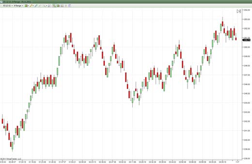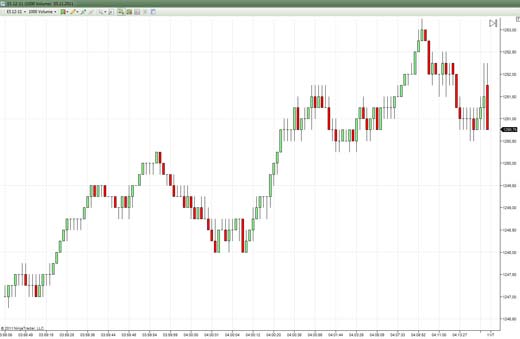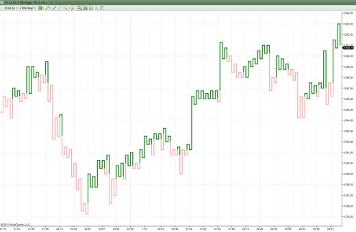 - свеча будет содержать конкретную волатильность, к примеру, 50 пунктов, что по сути дает крестики-нолики и цена отвязывается от временной шкалы