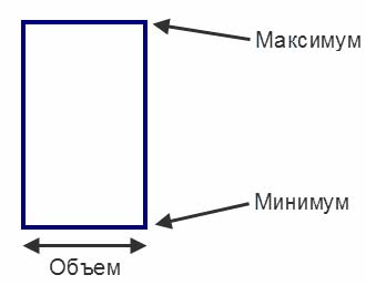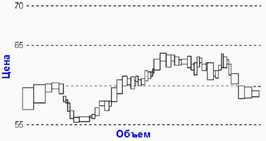 На равнообъемных графиках объем представлен не как второстепенный показатель под графиком цены, а одновременно с ней при помощи двухмерных прямоугольников. Верхняя сторона прямоугольника обозначает максимум цен за данный период, а нижняя - минимум. Ширина прямоугольника - в этом как раз уникальная особенность равнообъемных графиков - соответствует объему торгов за данный период.