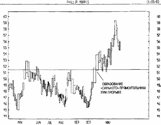 На рисунке показан равнообъемный график курса акций Phillip Morris. В период с июня по сентябрь наблюдалась консолидация цен с сопротивлением около 51,50 долл. Значительный подъем выше этого уровня в октябре сопровождался образованием сильного прямоугольника, подтвердившего прорыв.