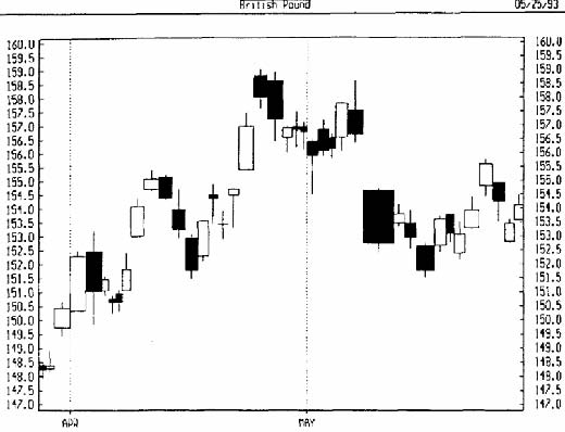Нижний рисунок представляет собой свечной равнообъемный график британского фунта. Сходство этого смешанного графика со свечным очевидно, но в данном случае ширина тел свечей меняется в зависимости от объема торгов.