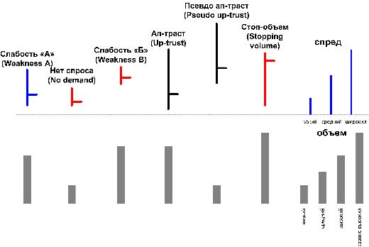 1 Цена начинает двигаться вверх, но очень медленно, на постепенно снижающимся объеме, каждый раз изматывая всех трейдеров ("пила"). Иногда могут даже резко приподняться, но объем должен быть ниже, чем на баре "stopping volume". После мы обязательно начнем находить несколько признаков слабости, таких как "отсутствие спроса", "слабость В", "слабость А", "ап-траст" и "псевдо ап-траст". Именно они послужат началом разворота, в зависимости от силы паттерна (о силе смотрите выше, при каких конфигурациях кто сильнее)