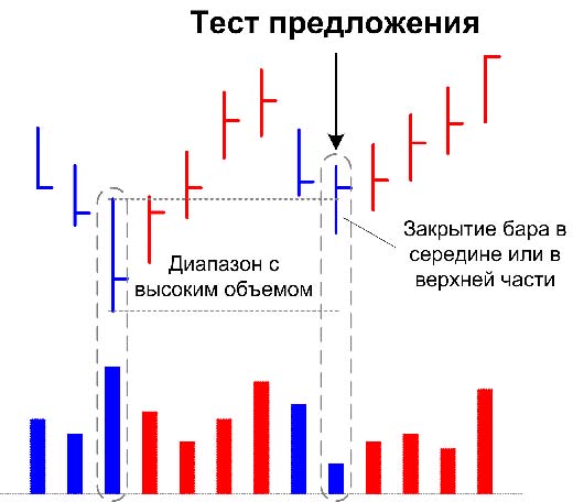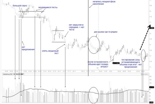 Логика такая: "умные деньги накопили достаточное количество акций (контрактов), но им необходимо убедиться, есть ли еще на рынке предложение, которое, возможно, будет в будущем выступать как сопротивление для нормального восходящего движения. И операторы резко понижают рынок в область, где в прошлом (здесь очень важен фон) были бары с высоким объемом. Таким движением "умники" скидывают нервных игроков, и устраняют препятствия для дальнейшего движнеия. Если же операторы видят, что слабых игроков не осталось на рынке (видно как низкий объем на тестовом баре), после этого, как правило, начинается сильное движение вверх, и как результат тест оказывается удачным.