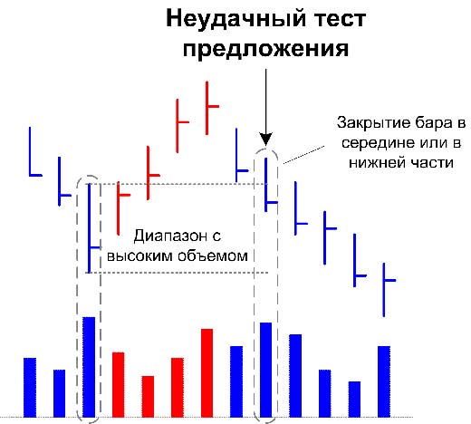 Удачный и неудачный тест спроса выглядит аналогичным образом, но с той лишь разницей, что крупные игроки задумали нисходящее движение и проверяют рынок на покупателей. Если покупатели много, то тест будет неудачным.