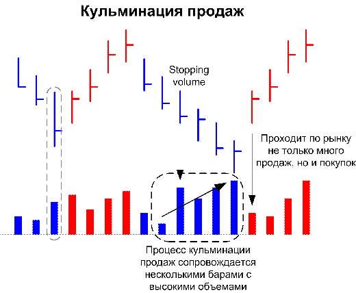 Характеризуется постепенным увеличением объема в конце тренда, когда уже значительная часть нисходящего движения пройдена, при этом общий рост объемов получается очень большим за длительную историю. Во время образования кульминации возможно появление одного или даже несколько баров stopping volume.