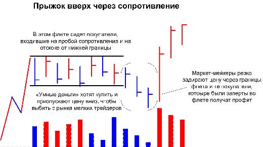 Когда толпу зажимают во флете, такой эффект еще называется ловушкой трейдеров. Наверно, у всех были минусовые позиции, да еще и без выставленных стоп-ордеров. Как вы при этом себя чувствовали? Естественно, не очень хорошо. Данный паттерн показывает на практике тот случай, когда крупные игроки заинтересованы в том, чтобы публика держала акции (контракты) на руках. Ведь, по идее, можно просто всех скинуть и скупить появившееся предложение. Видимо, крупные игроки не настолько бывают сильными, что могут поглотить все рыночное предложение. Они используют тонкие психологические трюки. Немного снижают цену, но не доводят её до массовых закрытий. А далее резко скупают всё по рынку и цена выстреливает вверх. Уже разочаровавшиеся трейдеры видят это и, наверно, впадают в состояние эйфории. Почти признанный убыток превращается на глазах в прибыль! Вот еще немножко и цена пойдет дальше. Закрывать еще рано. Все сидят в ожидании дальнейшего продолжения движения. Многие начинают докупать. Вот им-то и продают умные игроки и выходят из рынка с профитом.