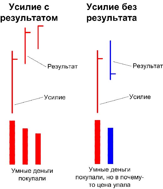 Допустим был большой объем на ап-баре с закрытием в верхней трети и после этого следующий бар идет вверх и закрывается так же в верхней трети, значит на первом ап-баре с большим объемом были именно покупки, и именно "умных денег". Значит усилие (в виде объема и среднего/широкого спреда с закрытием в верхней трети) было РЕЗУЛЬТАТИВНЫМ, рынок показал результат. Что это значит? То, что в первом баре были покупки серьезных людей знающих, куда пойдет рынок, либо двигающих его.